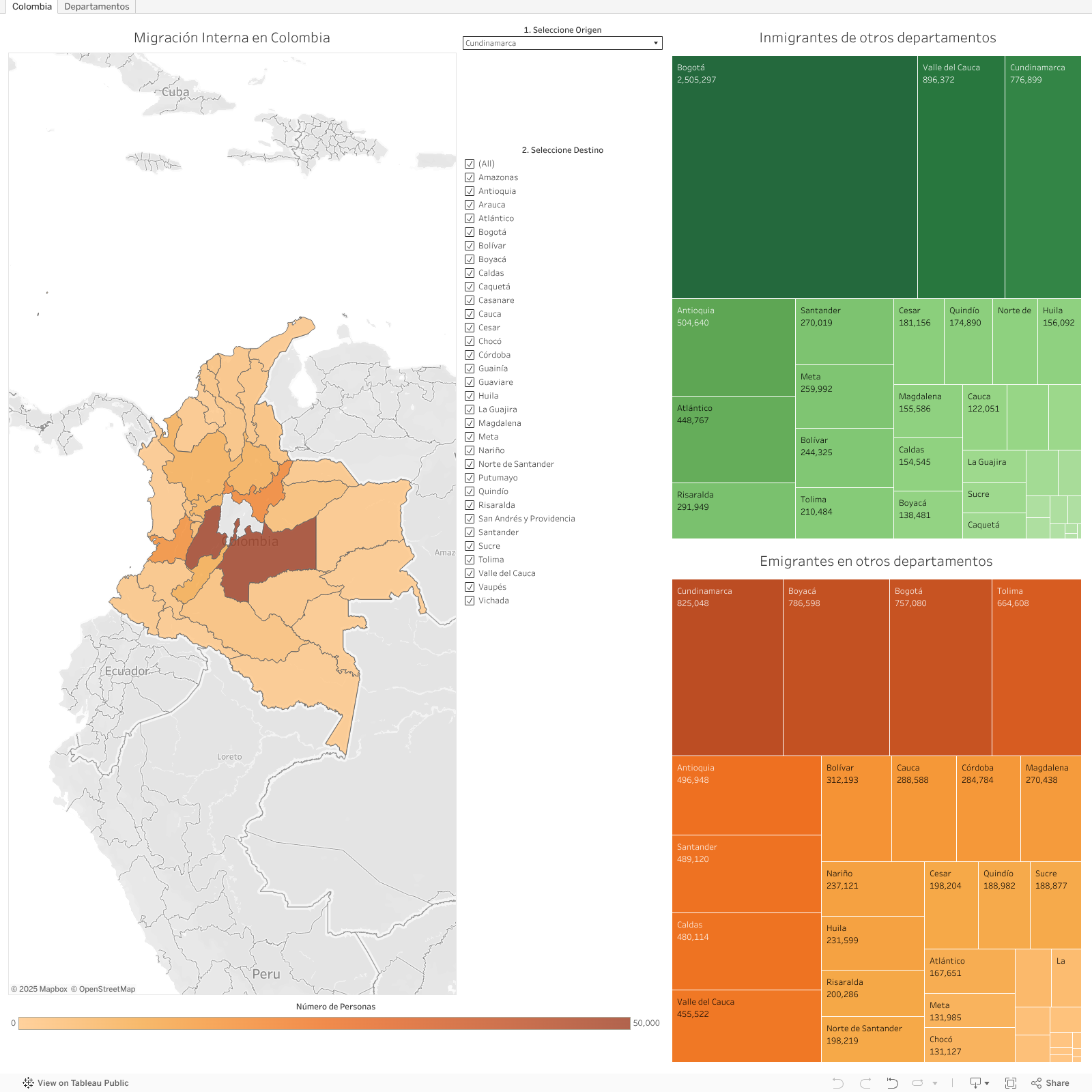 Bogotá ha sido la ciudad que ha recibido históricamente más migrantes internos en el país, según las estimaciones del Dane, Cali, Medellín y Barranquilla son respectivamente los siguientes lugares de destino, en contraste departamentos con gran población rural han sido expulsores tradicionales de población, entre los que se encuentran Boyacá, Tolima, Santander o Caldas.